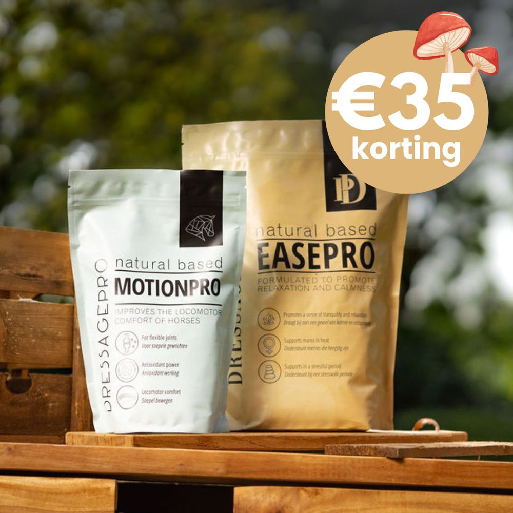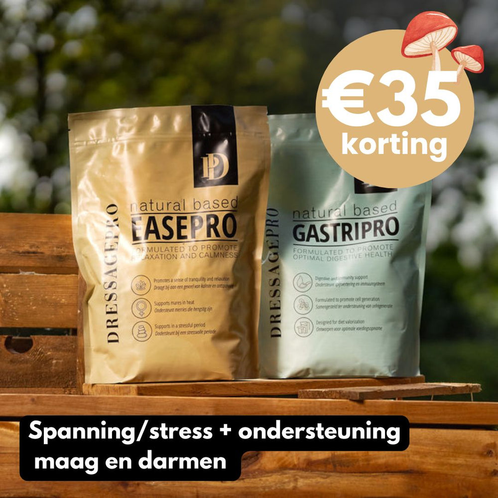 Onze webshop met paardensupplementen biedt een ruime keuze aan producten voor verschillende ondersteuningsbehoeften. Onze bestsellers zijn GastriPro, MotionPro en EasePro, die elk bijdragen aan de gezondheid en het welzijn van je paard. GastriPro ondersteunt een gezonde maag en darmflora, MotionPro stimuleert soepele spieren en gewrichten, en EasePro draagt bij aan het verminderen van stress bij je paard. Al onze supplementen zijn op natuurlijke basis en GMO-vrij, zodat je ze zonder zorgen kunt inzetten, zelfs tijdens het wedstrijdseizoen. Of je nu zoekt naar paardensupplementen voor het maag-darmkanaal, voor soepel bewegen of voor een ontspannen gemoedstoestand, je kunt ze allemaal bestellen in onze webshop.