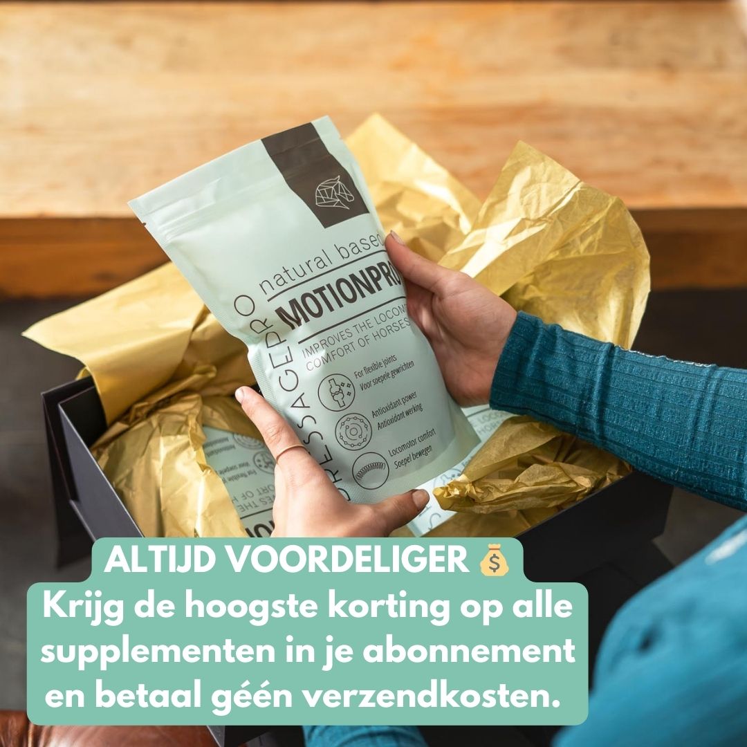 Het abonnement is niet alleen stress-vrij, maar we geven ook 17% korting op de supplementen voor je paard en je krijgt natuurlijk gratis verzending.